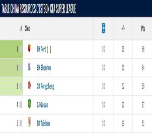 29轮之后,上海海港以63分排名榜首,而上海申花以61分排名第二位。以2分领跑,加上相互交锋成绩占优,只要最后一轮客场战平大连英博,上海海港就将完成队史首次三连冠。