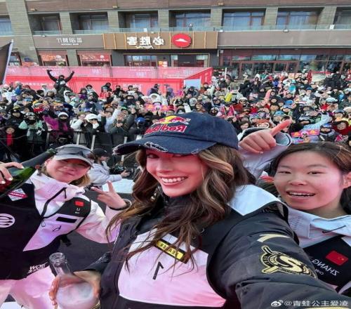 2025年12月6日,在张家口市崇礼区云顶滑雪公园举行的雪盟滑雪赛自由式滑雪U型场地技巧比赛中,中国队包揽女子组前三名:谷爱凌(中)夺得冠军,张可欣(右)、李方慧分列第二、三位。图为三人在赛后与雪场观众合影。图源:谷爱凌微博