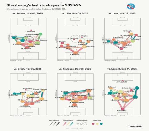 斯特拉斯堡可以根据对手切换阵型,其多变性允许罗塞尼尔在通常为3-4-2-1的三后卫体系,与4-3-3或4-2-3-1的四后卫体系之间交替。这在下面的近期传球网络图中得以体现。