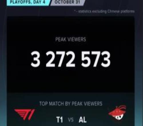 超过iG打T1!T1对战AL海外峰值来到327万,本次S赛新高