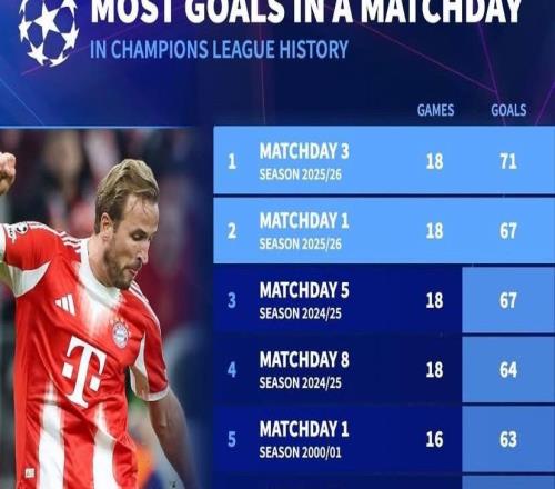 欧冠历史单轮进球数前10:本赛季第3轮71球第1,第1轮67球第2
