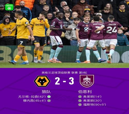 北京时间10月26日英格兰足球顶级联赛 联赛 第9轮,狼队主场对阵伯恩利。狼队尤尔根-拉森破门,穆内西破门。伯恩利弗莱明梅开二度,福斯特破门。最终比分狼队 2-3 伯恩利。关键事